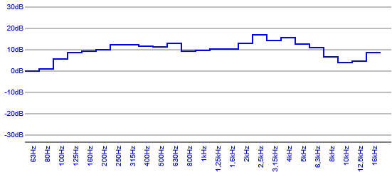 Courbe de réponse en fréquence mettant en évidence, la capacité des haut-parleurs à délivrer des sons graves, mediums et aigus.
