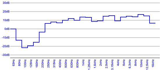 Courbe de réponse en fréquence mettant en évidence, la capacité des haut-parleurs à délivrer des sons graves, mediums et aigus.